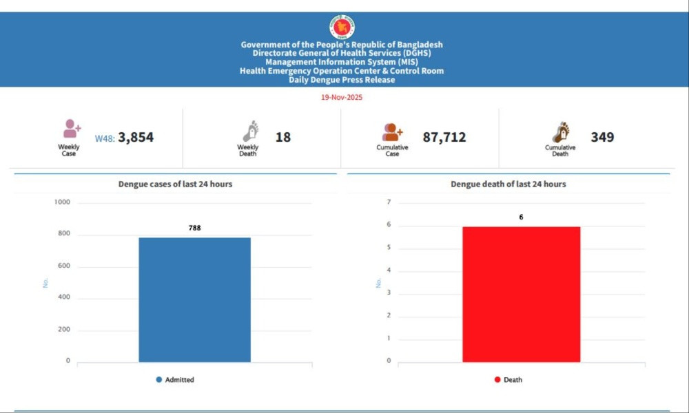 বুধবার (১৯ নভেম্বর) স্বাস্থ্য অধিদপ্তরের হেলথ অ্যান্ড ইমার্জেন্সি অপারেশন সেন্টার ও কন্ট্রোল রুমের সংবাদ বিজ্ঞপ্তি থেকে এ তথ্য জানা গেছে।হাসপাতালে ভর্তি হওয়া ডেঙ্গু রোগীদের মধ্যে এখন পর্যন্ত ৮৪ হাজার ৫৭০ জন সুস্থ হয়ে হাসপাতাল থেকে ছাড়পত্র পেয়েছে। বর্তমানে দেশের বিভিন্ন হাসপাতালে তিন হাজার ১৪২ জন ডেঙ্গু রোগী চিকিৎসাধীন।স্বাস্থ্য অধিদপ্তরের তথ্য অনুযায়ী, চলতি বছরে এখন পর্যন্ত ডেঙ্গুতে মৃত্যু হয়েছে ৩৪৯ জনের।