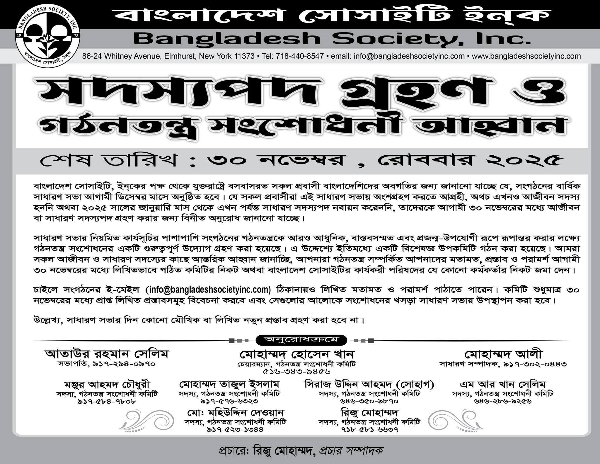 আপনারা চাইলে সংগঠনের ই-মেইল (info@bangladeshsocietyinc.com) ঠিকানায়ও লিখিত মতামত ও পরামর্শ পাঠাতে পারেন। কমিটি শুধুমাত্র ৩০ নভেম্বরের মধ্যে প্রাপ্ত লিখিত প্রস্তাবসমূহ বিবেচনা করবে এবং সেগুলোর আলোকে সংশোধনের খসড়া সাধারণ সভায় উপস্থাপন করা হবে। সাধারণ সভার দিন কোনো মৌখিক বা লিখিত নতুন প্রস্তাব গ্রহণ করা হবে না।